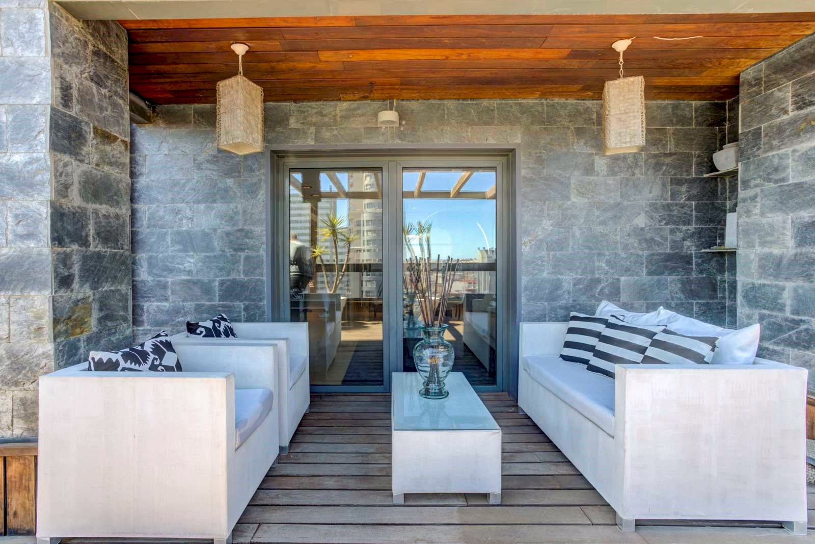 The property stands out for its large open terrace, accessible from the living room and the kitchen and covered with slate on the walls and IPE wood on the floor. The apartment also stands out for its luminosity and a magnificent panoramic view, visible from any room in the house.