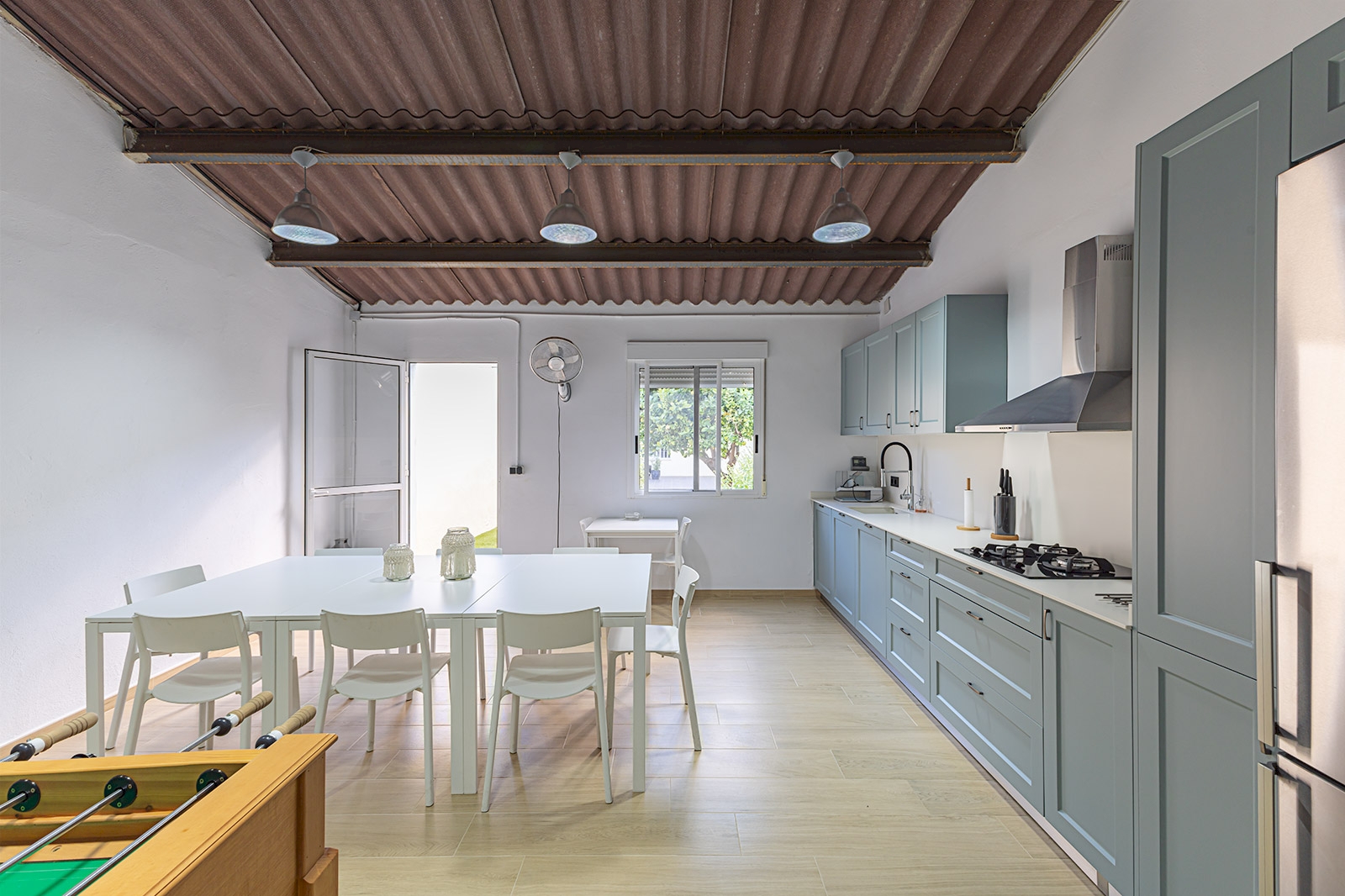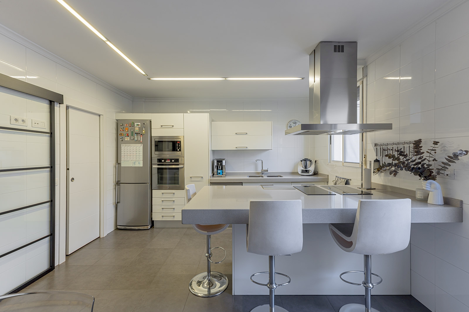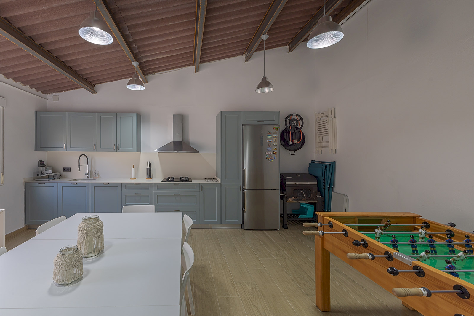 Accessed from the outside by a ramp on the ground floor where there is a large garage with capacity for 3 or 4 vehicles. A gym to stay fit and a storage room for additional storage space. The first floor houses a cozy living room with an electric fireplace, a convenient guest bathroom with a shower, a fully equipped kitchen with a gallery, and a pantry. The kitchen opens onto a terrace and an outdoor area that combines pavement with artificial turf. The gem of this area is the covered barbecue area, complete with a fully equipped integrated kitchen and a spacious dining area, perfect for outdoor entertainment.