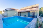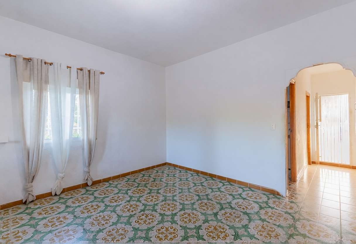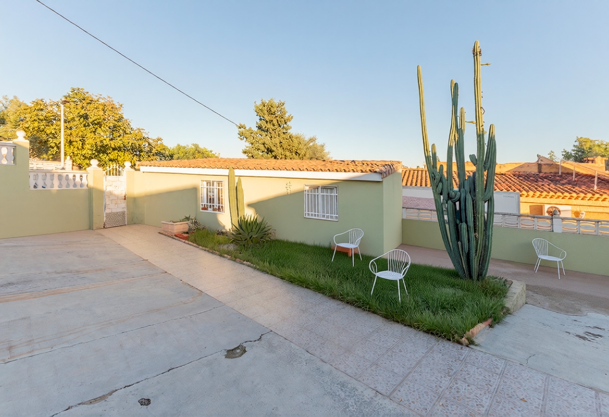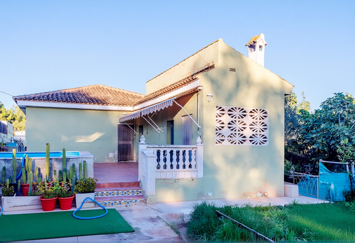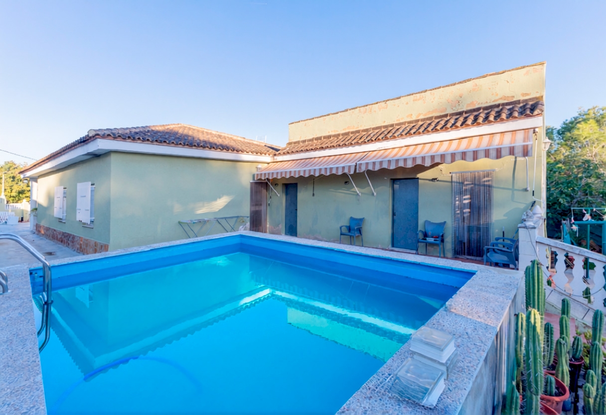 La casa se distribuye en una sola planta con tres habitaciones dobles, cocina independiente, salón comedor y dos baños completos, uno de los cuales sen encuentra en el exterior. En la parte delantera se encuentra una agradable terraza cubierta, mientras que en la zona posterior, junto a la piscina de 17 m², se ubica un práctico paellero. El acceso a la parcela cuenta con entrada peatonal y otra independiente directa al garaje cerrado, que además dispone de una zona de almacén.