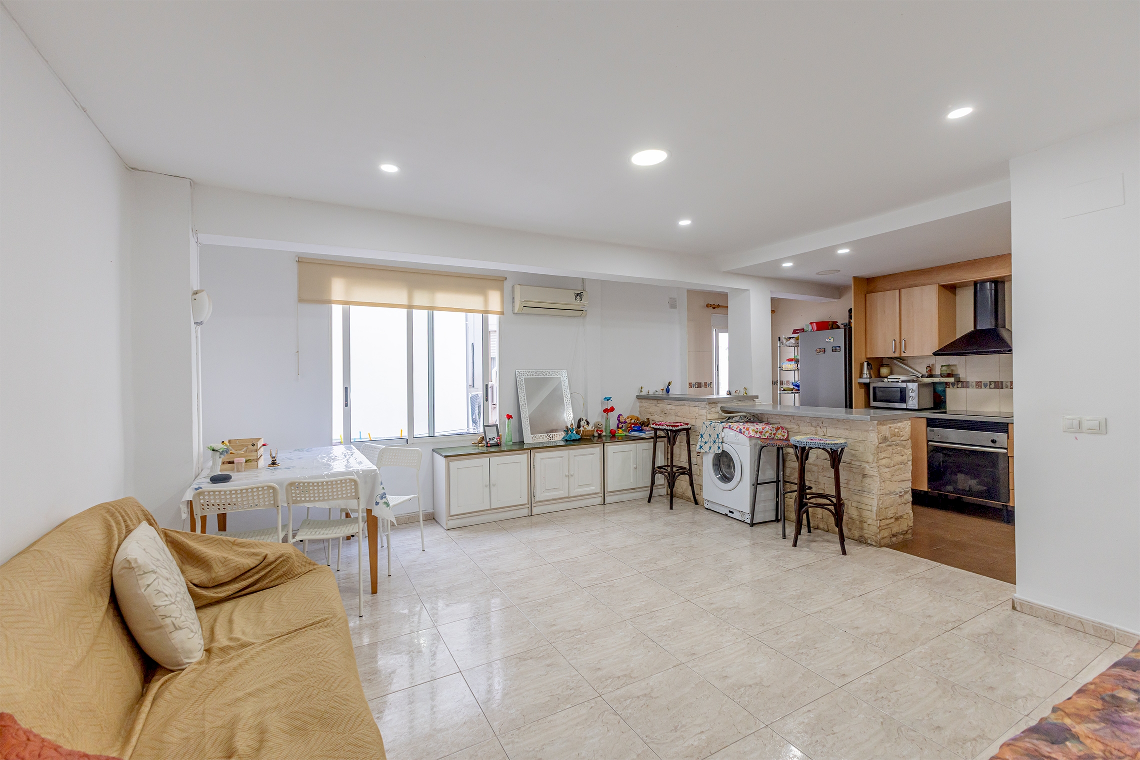 Se compone de tres habitaciones, de las cuales dos son exteriores y recaen a la calle, aportando luz natural y ventilación. El espacio principal se organiza en un amplio salón-comedor con la cocina integrada, creando una zona de día cómoda y actual. Además, dispone de galería, un baño completo y aire acondicionado.