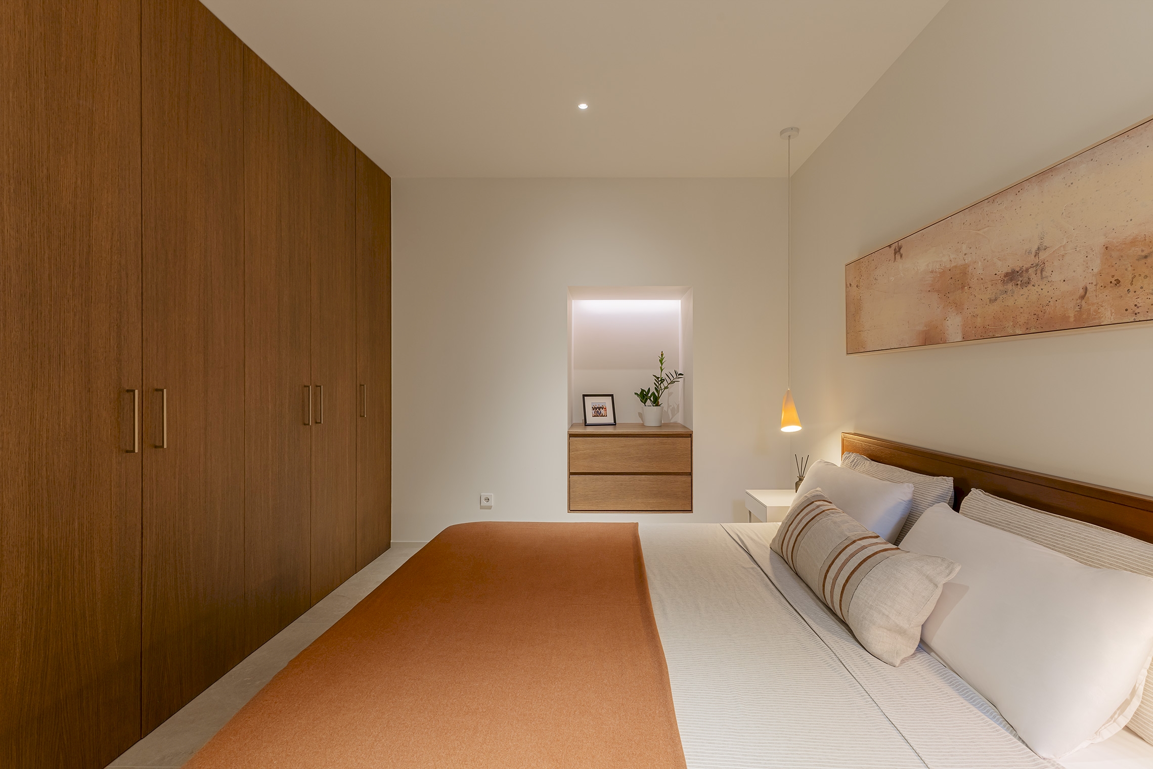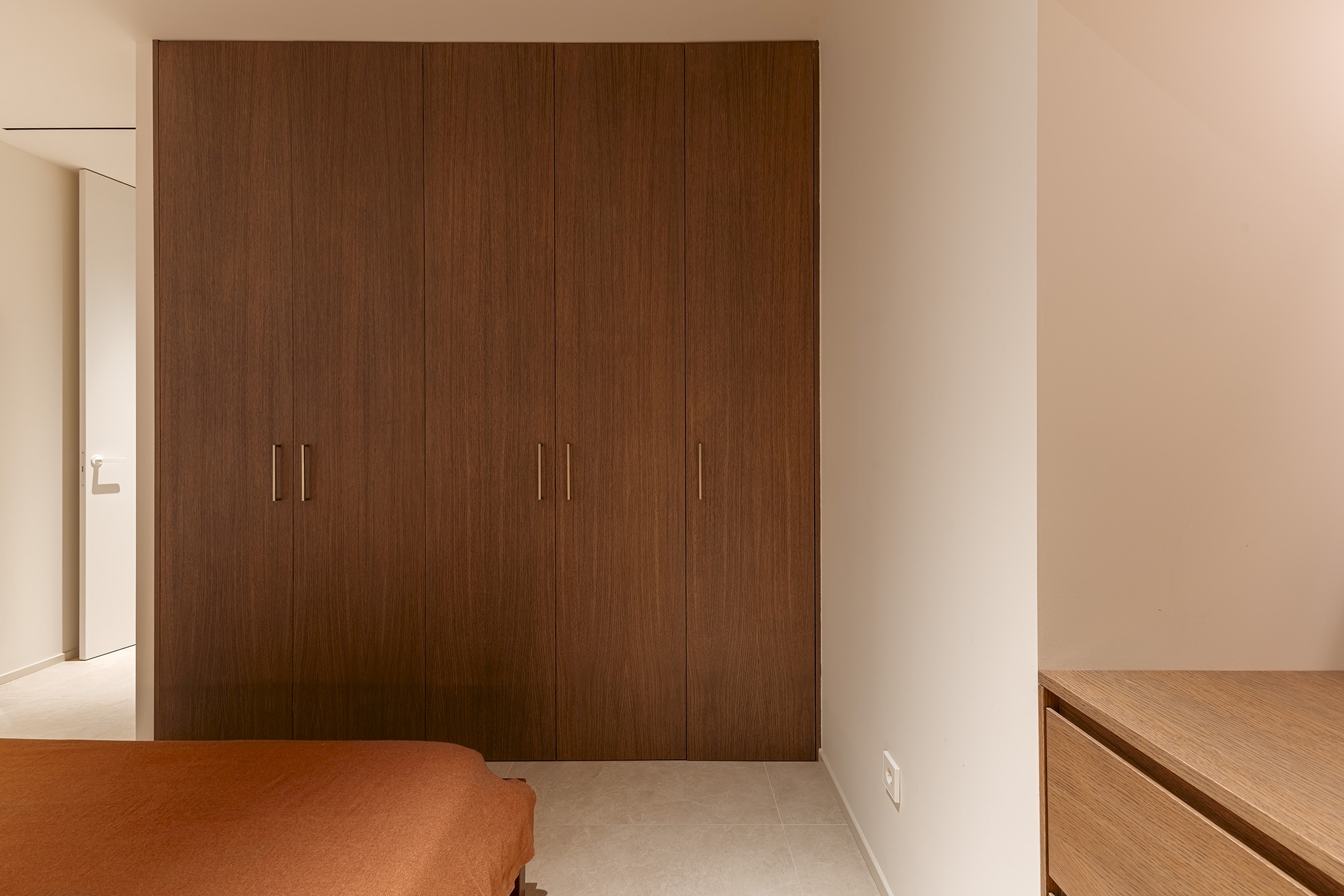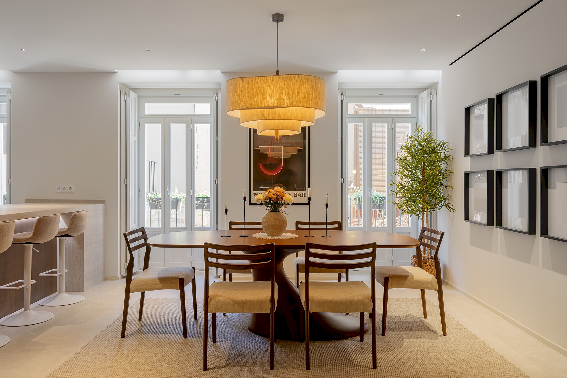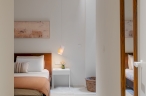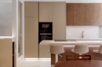 Para ello, se implementó una redistribución completa, resultando en dos dormitorios, uno de ellos provisto de un vestidor de amplia capacidad y funcionalidad. La cocina se integró en el espacio del salón, favoreciendo la interacción social y la percepción de amplitud. Adicionalmente, se diseñaron dos baños completos y se optimizaron las zonas de almacenaje en todas las estancia. La carpintería interior, incluyendo puertas de paso y armarios integrados con puertas de suelo a techo, fue fundamental para potenciar la continuidad visual y la sensación de amplitud en toda la vivienda.