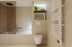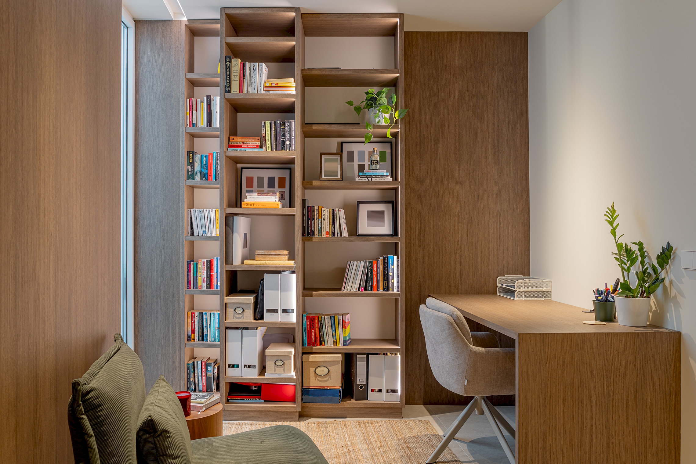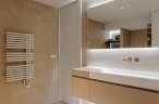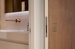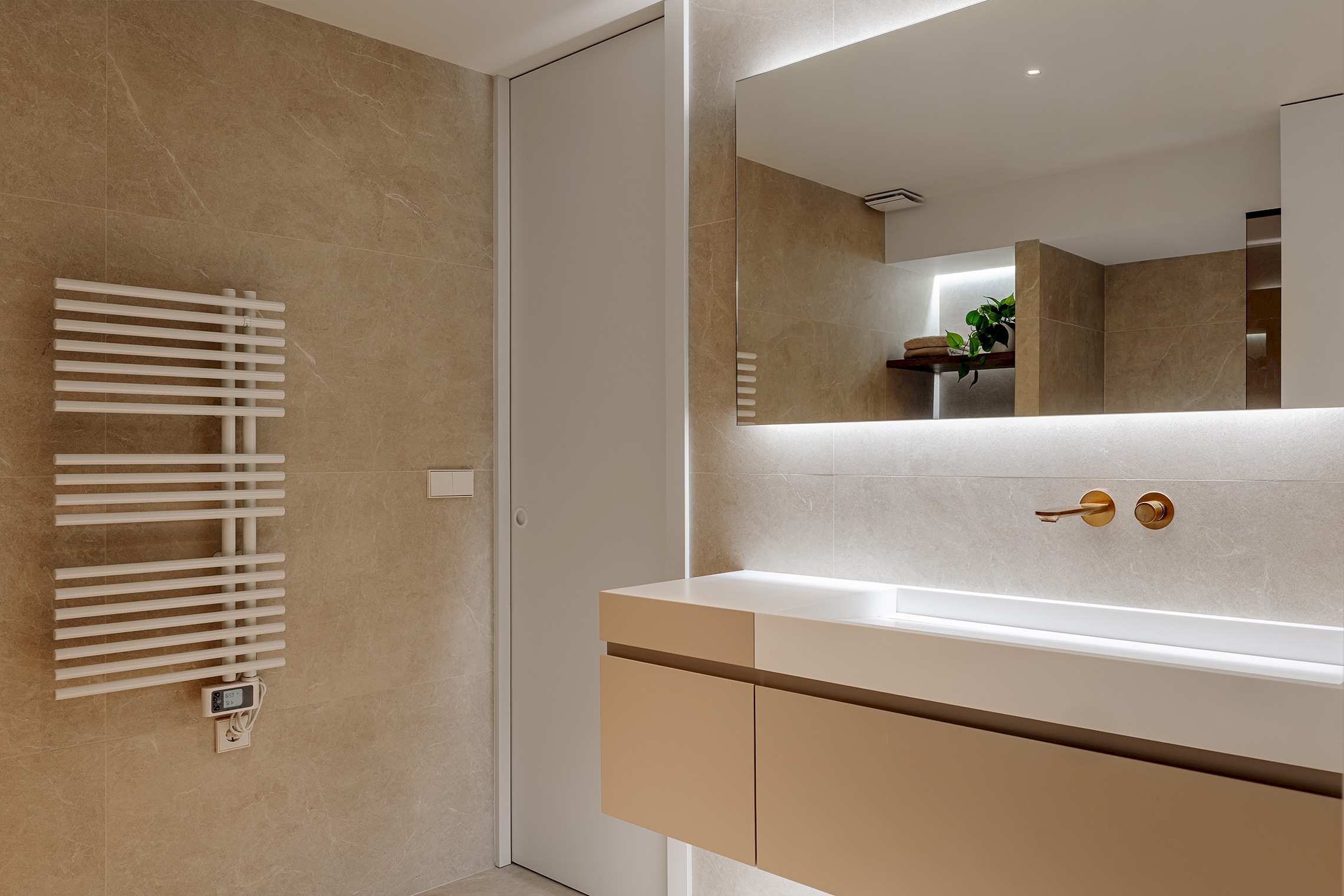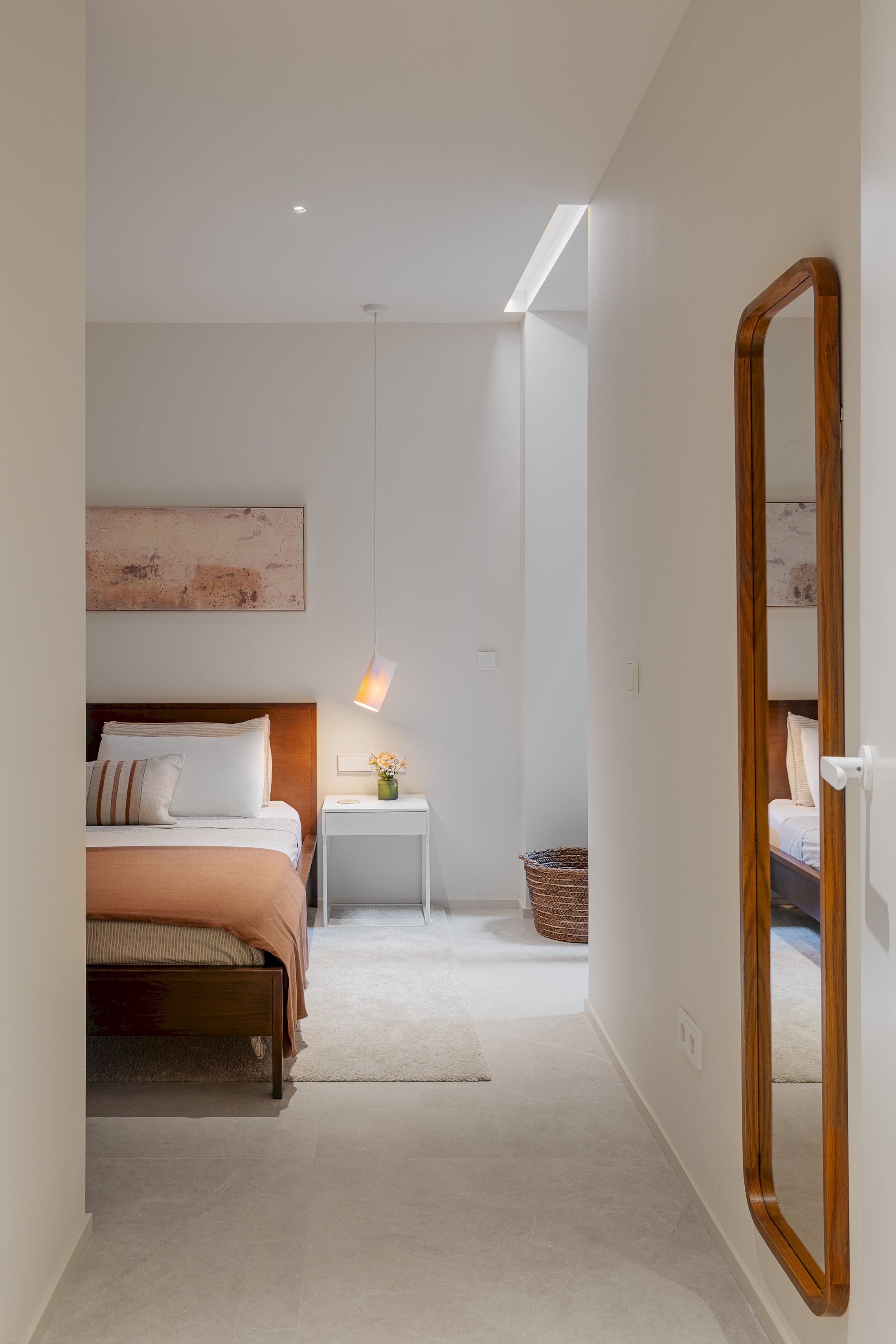 Para ello, se implementó una redistribución completa, resultando en dos dormitorios, uno de ellos provisto de un vestidor de amplia capacidad y funcionalidad. La cocina se integró en el espacio del salón, favoreciendo la interacción social y la percepción de amplitud. Adicionalmente, se diseñaron dos baños completos y se optimizaron las zonas de almacenaje en todas las estancia. La carpintería interior, incluyendo puertas de paso y armarios integrados con puertas de suelo a techo, fue fundamental para potenciar la continuidad visual y la sensación de amplitud en toda la vivienda.