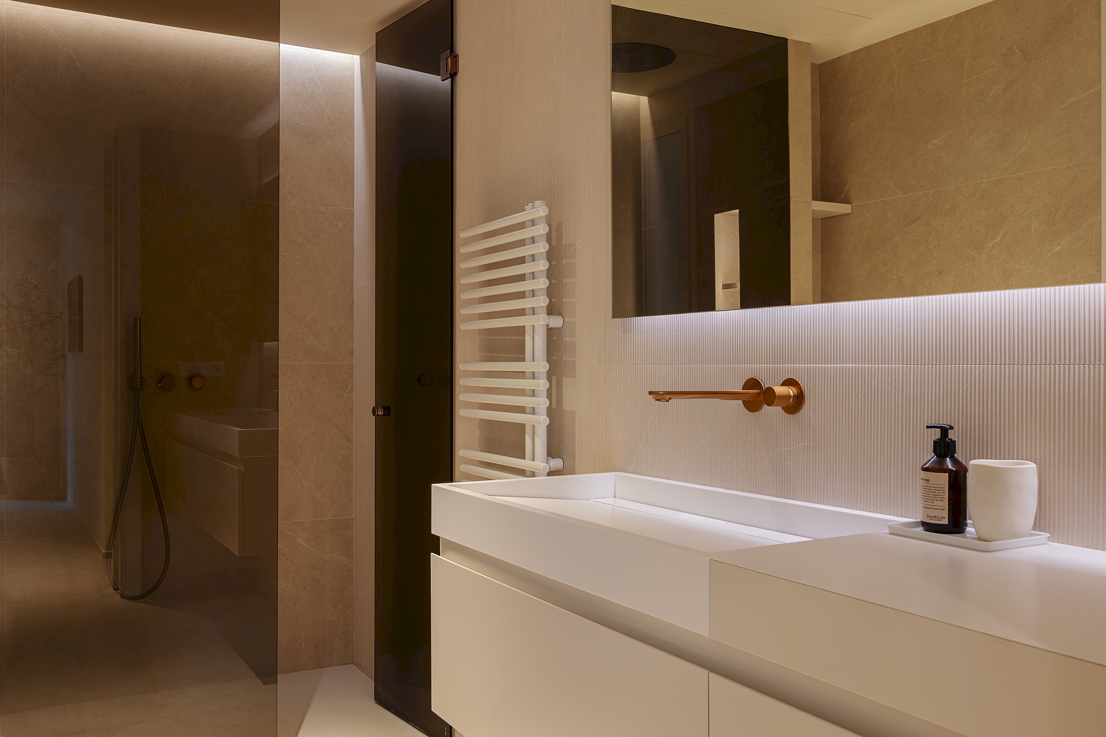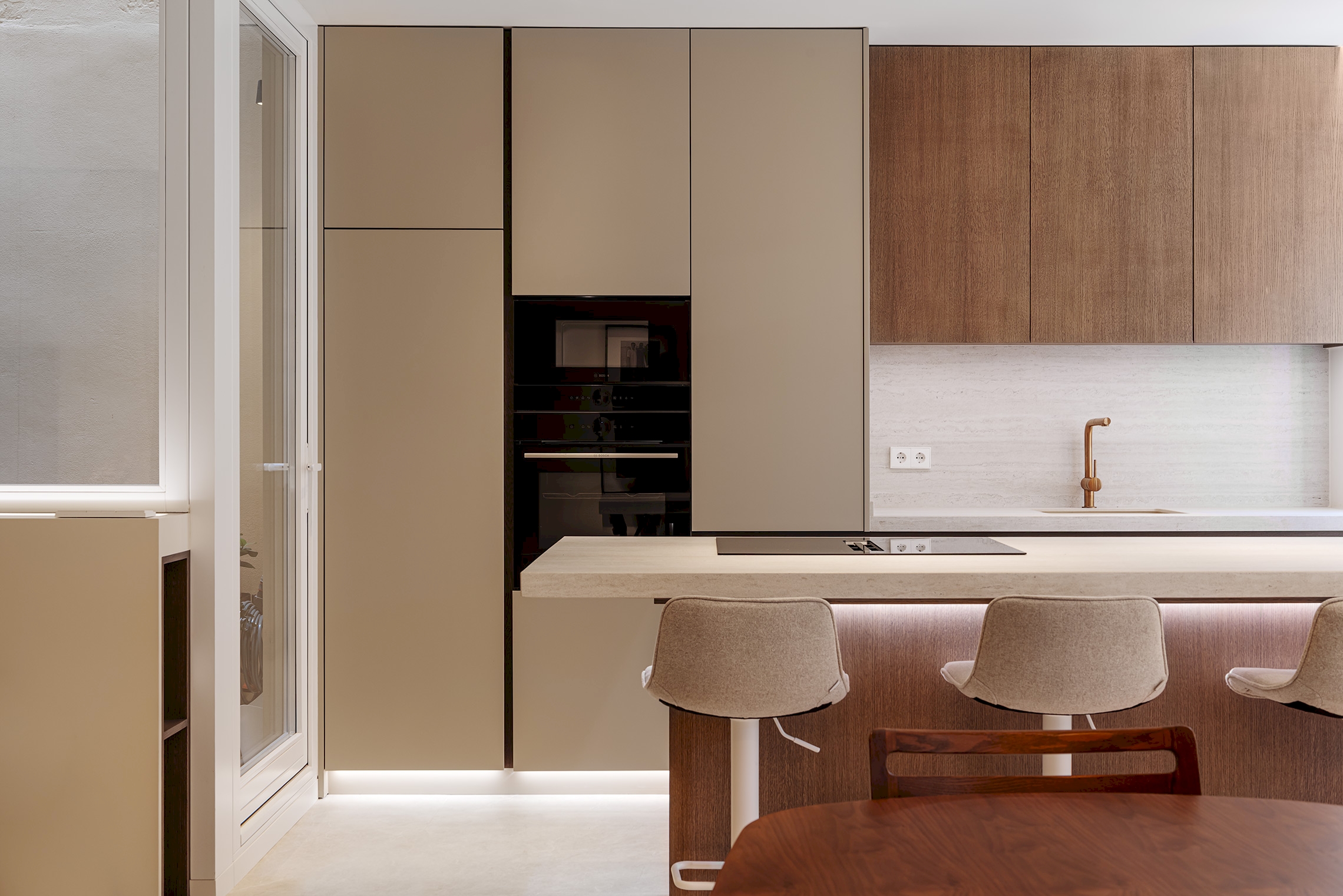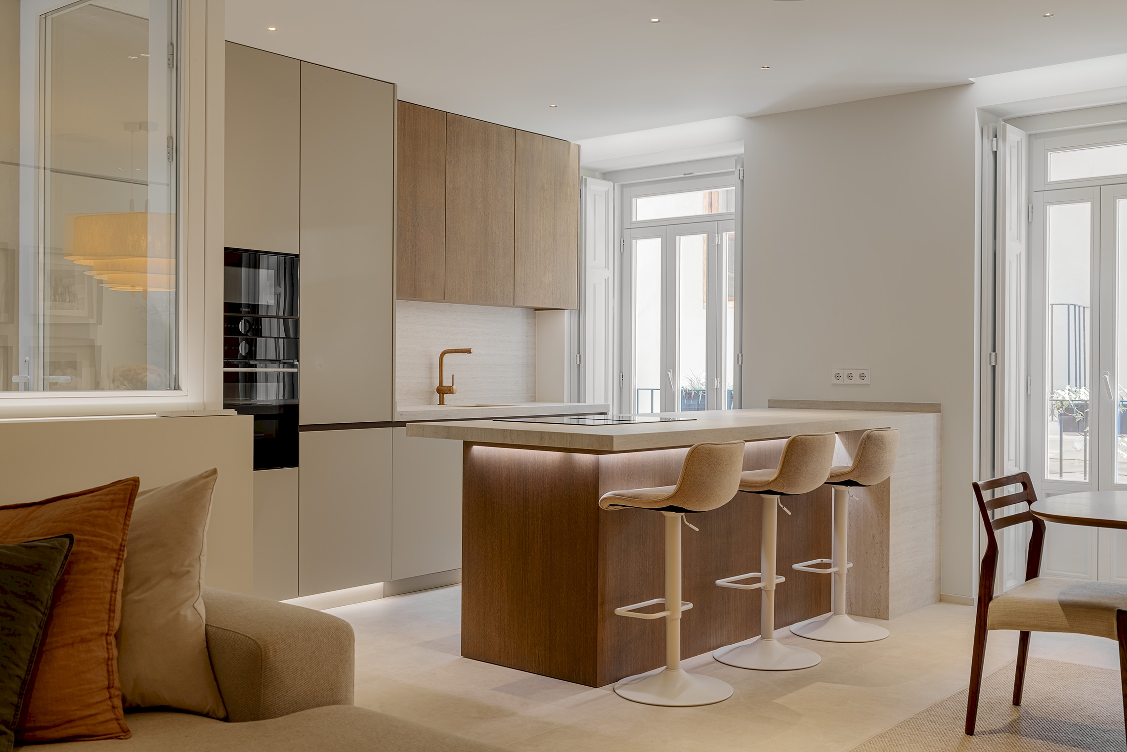 La carpintería a medida, abarcando la cocina, el mobiliario de baño y las soluciones fijas, fue ejecutada por Nomi. El diseño de la iluminación fue desarrollado por Illumination Works, asegurando una atmósfera adecuada en cada estancia. Finalmente, la concepción arquitectónica general de esta transformación corrió a cargo de Eseiesa Arquitectos.